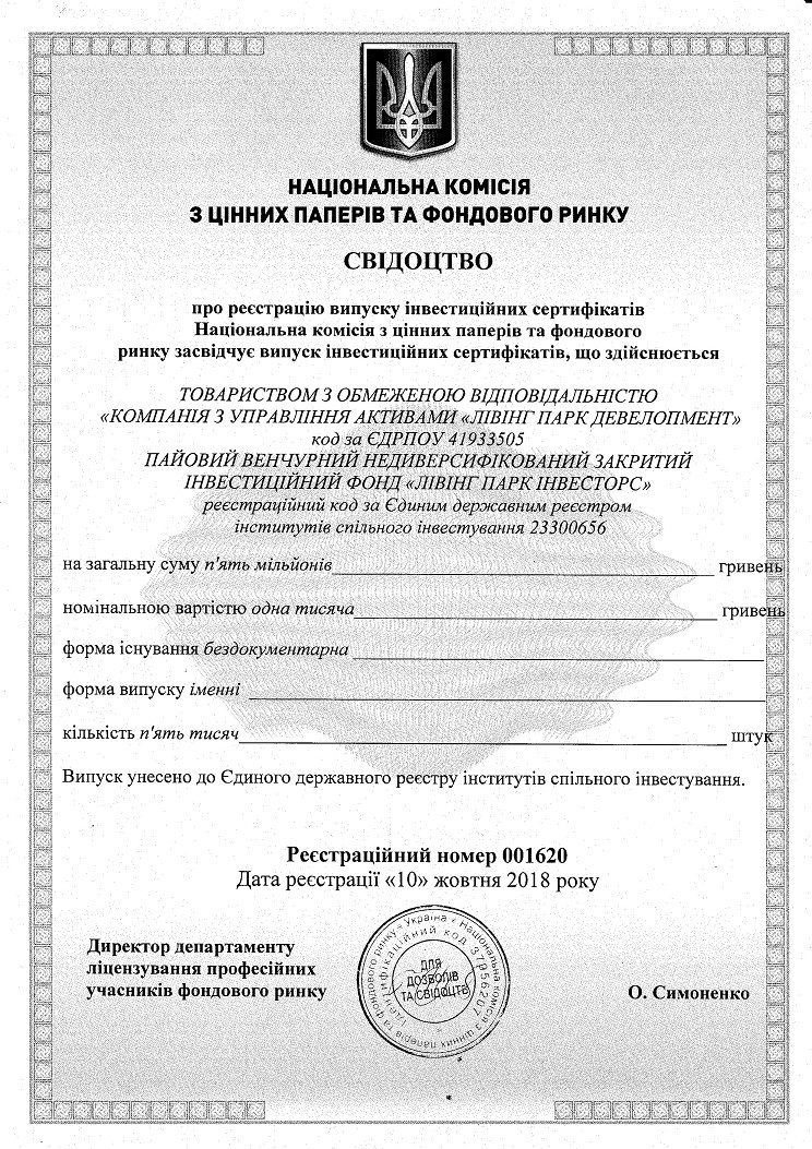 Ліцензія на провадження професійної діяльності на фондовому ринку – діяльності з управління активами інституційних інвесторів (діяльності з управління активами) ТОВ “КУА “ЛІВІНГ ПАРК ДЕВЕЛОПМЕНТ”